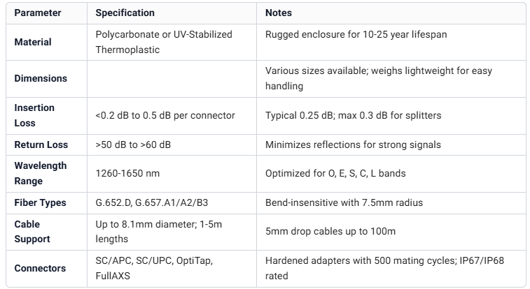 .Multiple Port Configurations: Offering 4, 8, 12, or 16 output ports, each supporting single-mode G.652.D fibers with SC/UPC hardened connectors. It includes versatile options like 2×8 splitter setups and 2 mid-span access ports for added flexibility . High-capacity models support 24-fiber configurations via 12 duplex SC/APC ports and two 1×12 PLC splitters with 0.3 dB insertion loss